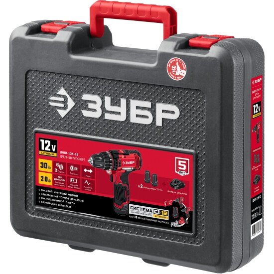 ЗУБР С1-12, 12 В, 30 Нм, 2 АКБ (2 Ач), дрель-шуруповерт, кейс (ДШЛ-125-22)
