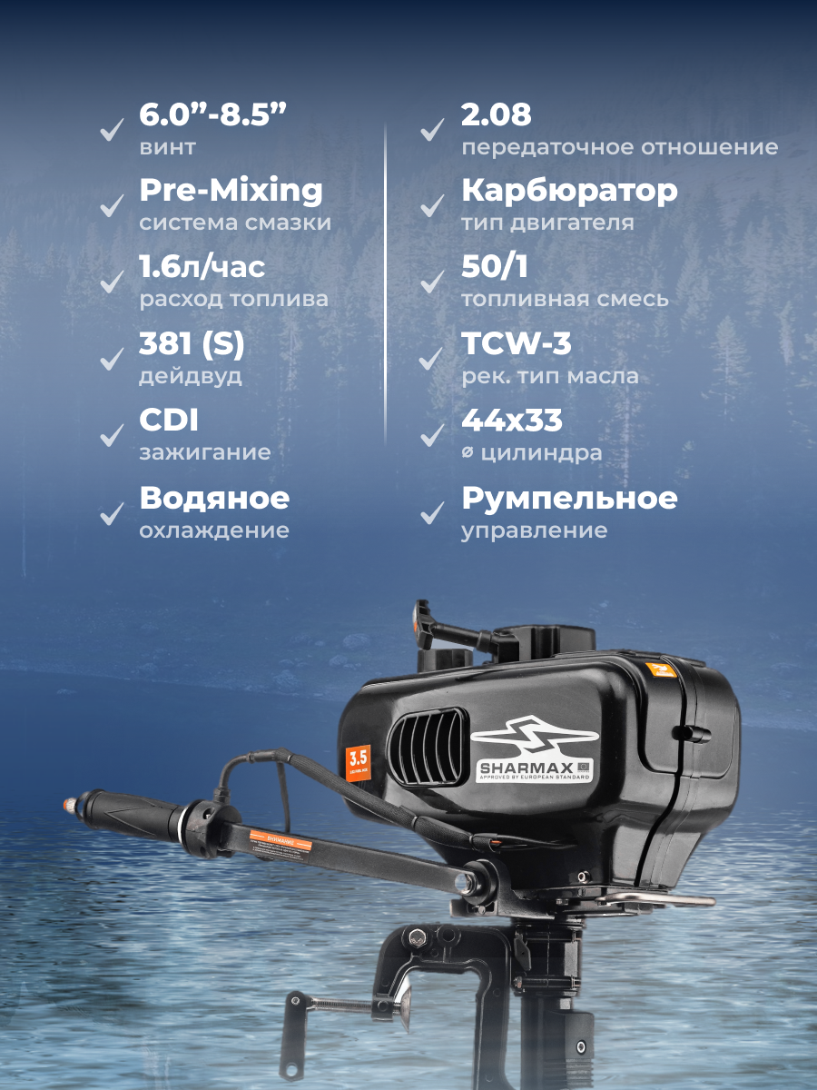 Лодочный мотор бензиновый двухтактный Sharmax SM3.5HS light 3.5. л.с. подвесной для надувной гребной лодки ПВХ интересное: