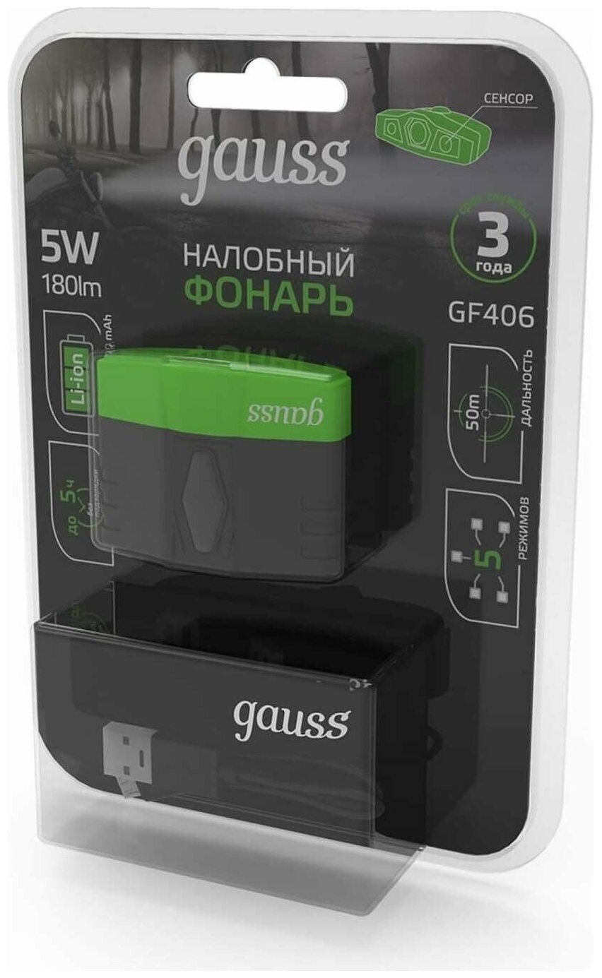 Фонарь налобный GAUSS модель GFL406 5W 180lm Li-ion 500mAh LED 1/12/72