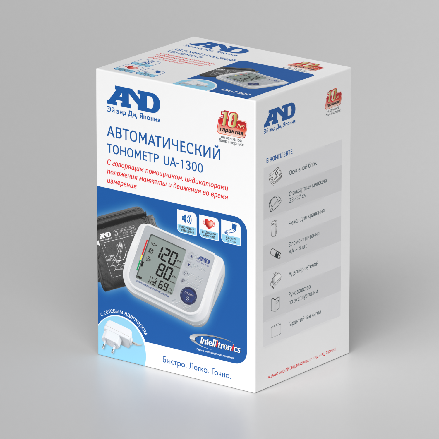| Дополнительная информация | для ежедневного контроля давления утром и вечером с голосовым помощником; с системой интеллектуального управления, большим экраном, шрифтом Брайля на панели прибора, индикаторами положения манжеты и движения во время измерения, универсальной манжетой 23-37 см, чехлом для хранения и сетевым адаптером; гарантия на основной блок в корпусе 10 лет |