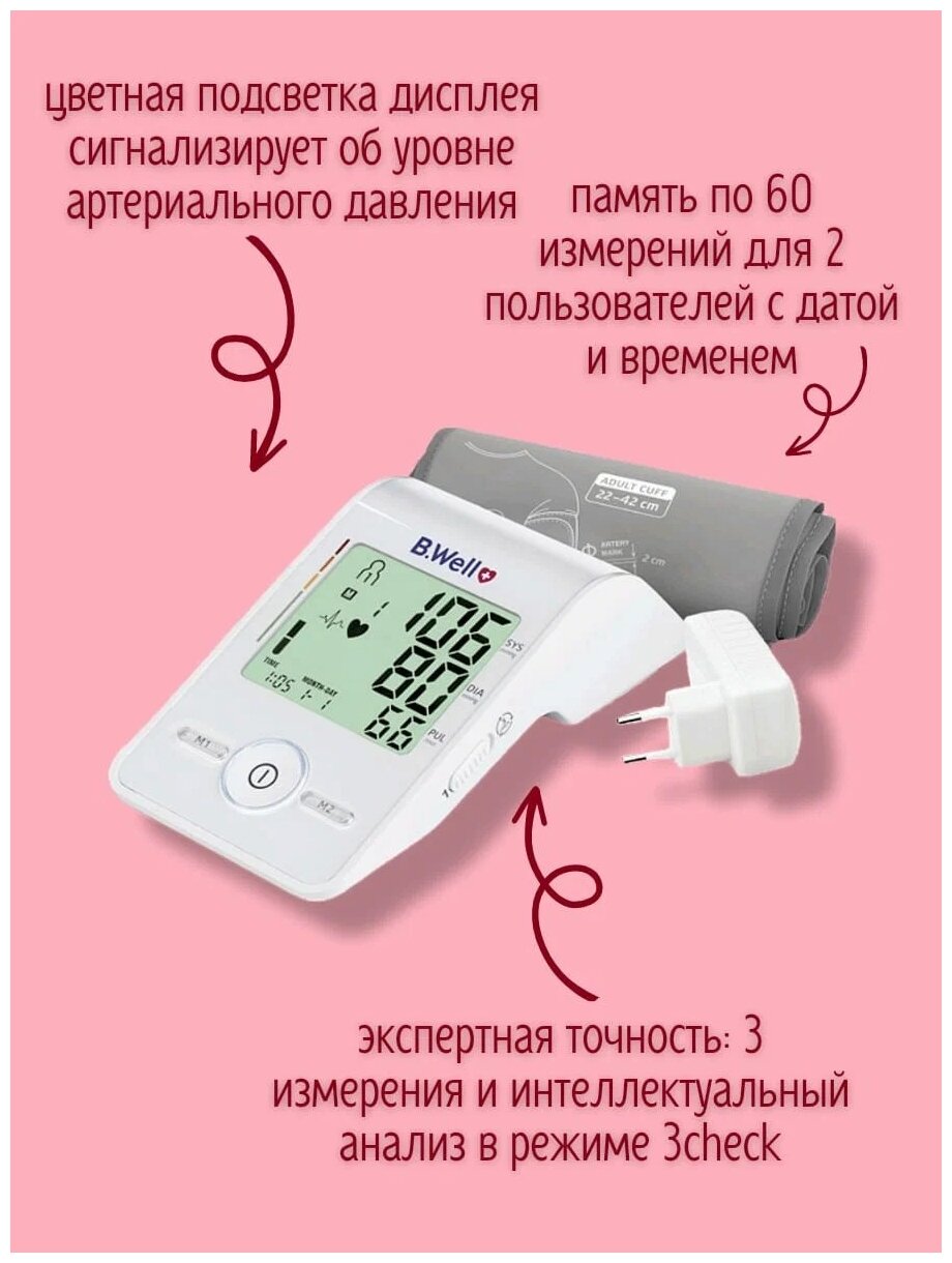 Тонометр B.Well MED-55 + адаптер + универсальная манжета 22-42см, тройное измерение 3Check, дисплей-светофор, Micro USB разъем питания