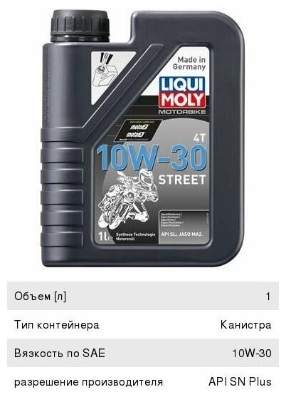 Масло LIQUI MOLY 4T Motorbike Street 10W30 SN Plus, MA2 (1л) синт. для 4-тактных мотоциклов
