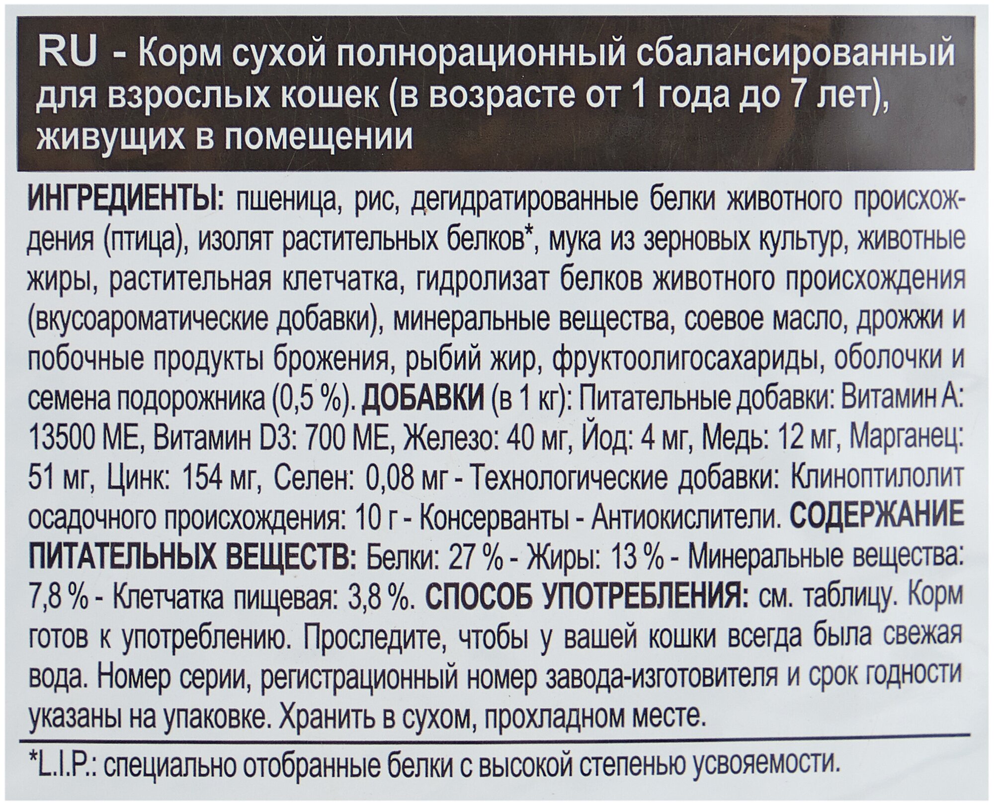| Состав | пшеница, рис, дегидратированные белки животного происхождения (птица), изолят растительных белков, мука из зерновых культур, животные жиры, растительная клетчатка, гидролизат белков животного происхождения (вкусоароматические добавки), минеральные вещества, соевое масло, дрожжи и побочные продукты брожения, рыбий жир, фруктоолигосахариды, оболочки и семена подорожника (0.5 %) |