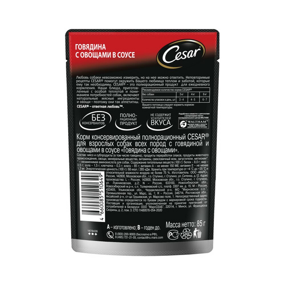 Cesar Паучи для взрослых собак, с говядиной и овощами в соусе, 85г 10222809, 0,085 кг
