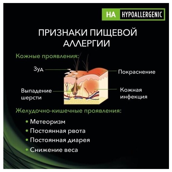 | Дополнительная информация | в качестве источника белка используется белки сои; рекомендуемая продолжительность кормления — от 3 до 8 недель; при исчезновении симптомов аллергии кормление этим кормом можно продолжить; перед применением рекомендуется проконсультироваться с ветеринарным врачом; следите, чтобы у собаки всегда была питьевая вода; для собак весом более 70 кг: на каждые дополнительные 5 кг веса добавляйте 35 г корма; для щенков в возрасте до 3 месяцев разделите рекомендуемую дневную норму кормления на 3-4 приема пищи и размочите водой; по достижении трехмесячного возраста постепенно снижайте количество воды, добавляемой для размачивания корма |