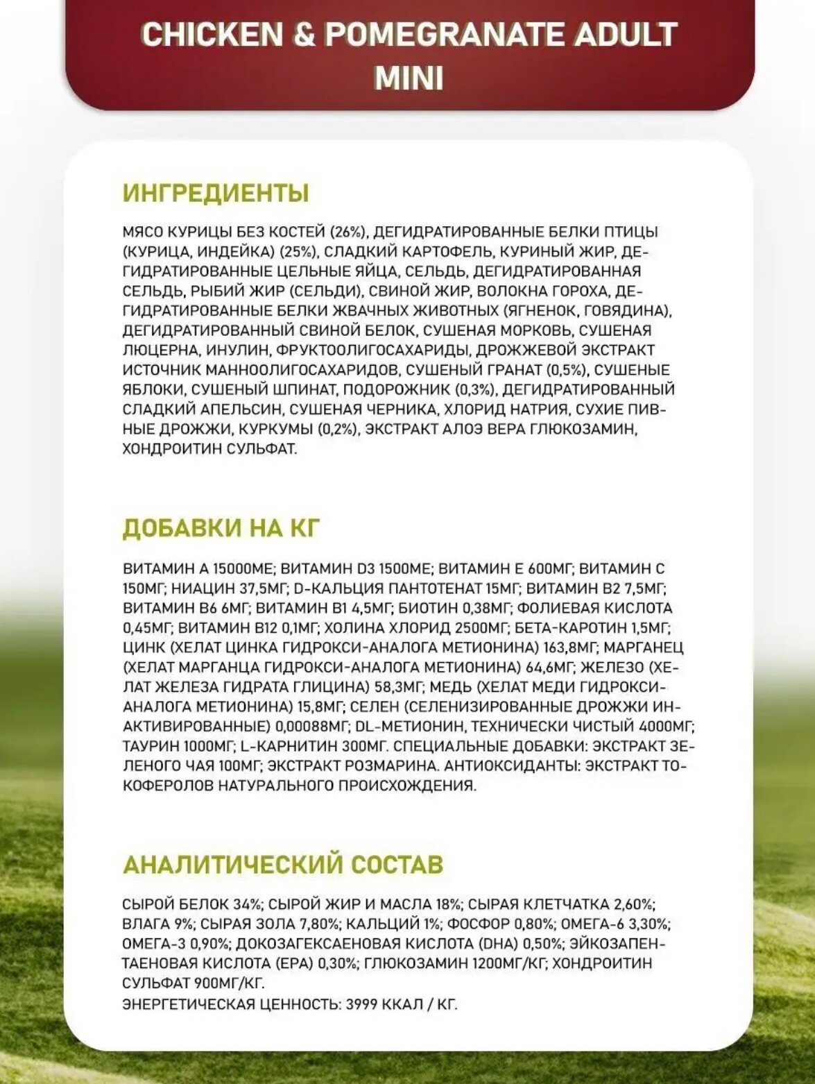 | Состав | свежее мясо курицы без костей (26%), дегидратированное мясо курицы (25%), картофель, куриный жир, дегидратированные цельные яйца, свежая сельдь, дегидратированная сельдь, рыбий жир, гидролизат животных белков, волокна гороха, сушеная морковь, сушеная люцерна, инулин, фруктоолигосахариды, маннанолигосахариды, порошок граната (0,5%), дегидратированные яблоки, порошок шпината, подорожник (0,3%), порошок черной смородины, дегидратированный сладкий апельсин, порошок черники, хлорид натрия, дрожжи сухие пивные, корень куркумы (0,2%), глюкозамин, хондроитин сульфат, экстракт календулы (источник лютеина) |