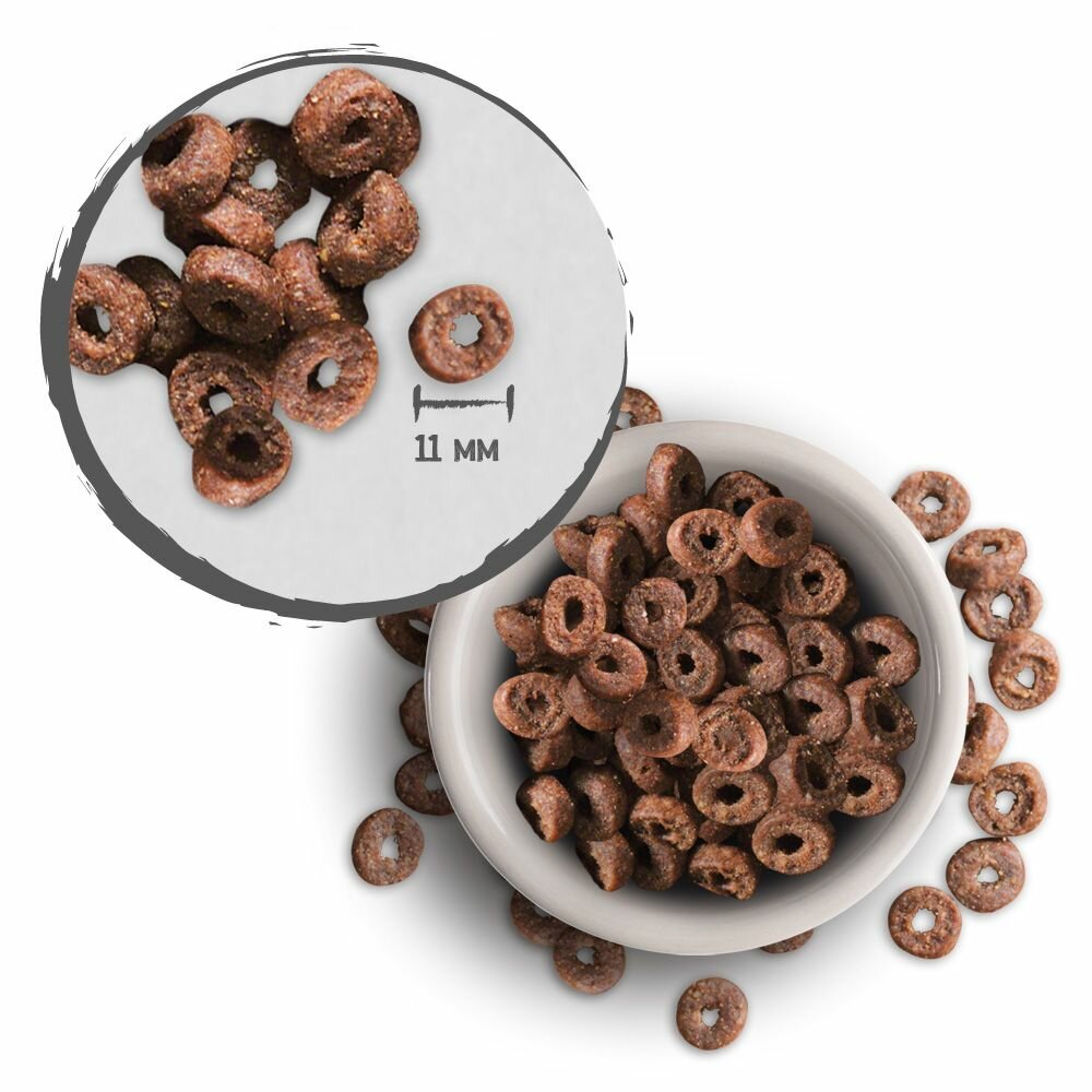 | Состав | белок домашней птицы пониженной зольности, высушенный (33%), кукуруза, жир домашней птицы, пшеница, мука сельди (5%), рис, рожь, солод (4%), гидролизат печени птицы, высушенное яйцо, пивные дрожжи, сушёные (2,5%), льняное семя (1,1%), калий хлористый, поваренная соль, инулин |