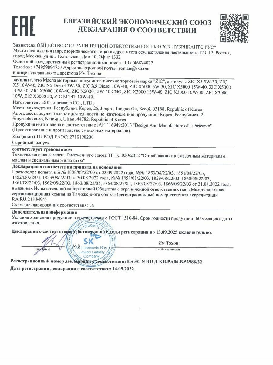 Синтетическое моторное масло ZIC X5 DIESEL 10W-40, 1 л, 1 кг, 12 шт