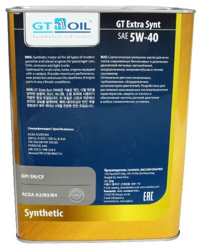 Моторное масло GT OIL, синтетическое GT Extra Synt SAE 5W-40 API SM/CF 4л, 8809059407417