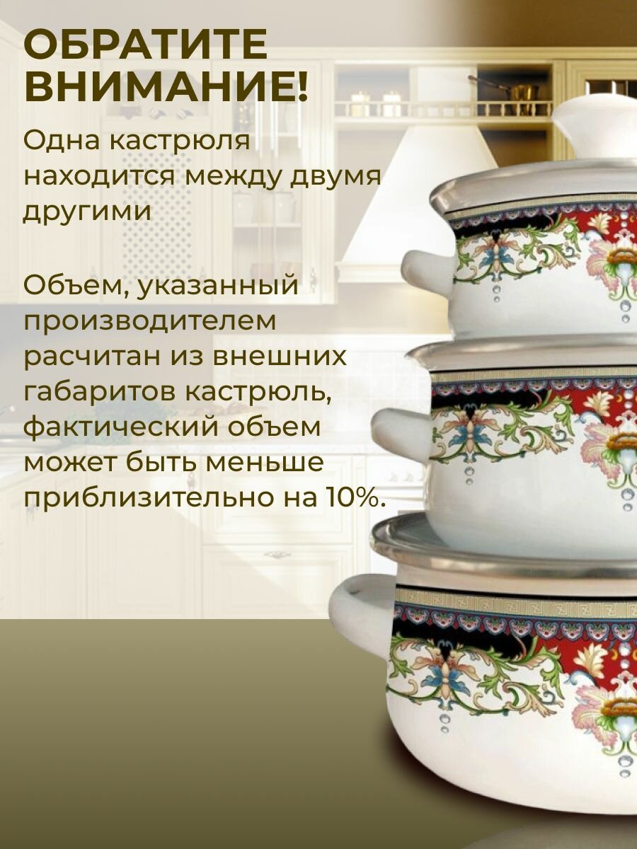 | Плюсы: | Подобный набор прослужил мне больше десяти лет, искала такой же, очень довольна, что нашла)) Пришёл с таким же рисунком, как в заказе, без сюрпризов. Эмаль качественная, всё сделано аккуратно. Размер меня полностью устраивает, так как ведрами не едим, а на одного-двоих удобно сварить или разогреть. Свежеприготовленное больше нравится. Даже в самой маленькой кастрюле удобно сварить пару яиц всмятку, не нужно брать большую кастрюлю |