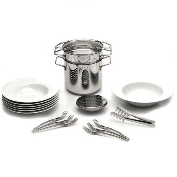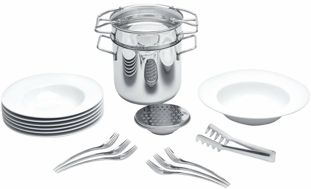 | Комплектация | кастрюля: 20 см; пароварка: 20 см; крышка; тарелки: 27 см (6 шт.); миска для салата: 31 см; миска для соуса: 14 см; терка с силиконовым кольцом: 15 см; вилки: (6 шт.); щипцы для макарон: 27 см |