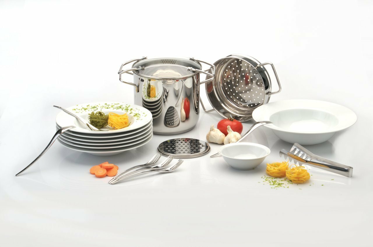 | Комплектация | кастрюля: 20 см; пароварка: 20 см; крышка; тарелки: 27 см (6 шт.); миска для салата: 31 см; миска для соуса: 14 см; терка с силиконовым кольцом: 15 см; вилки: (6 шт.); щипцы для макарон: 27 см |