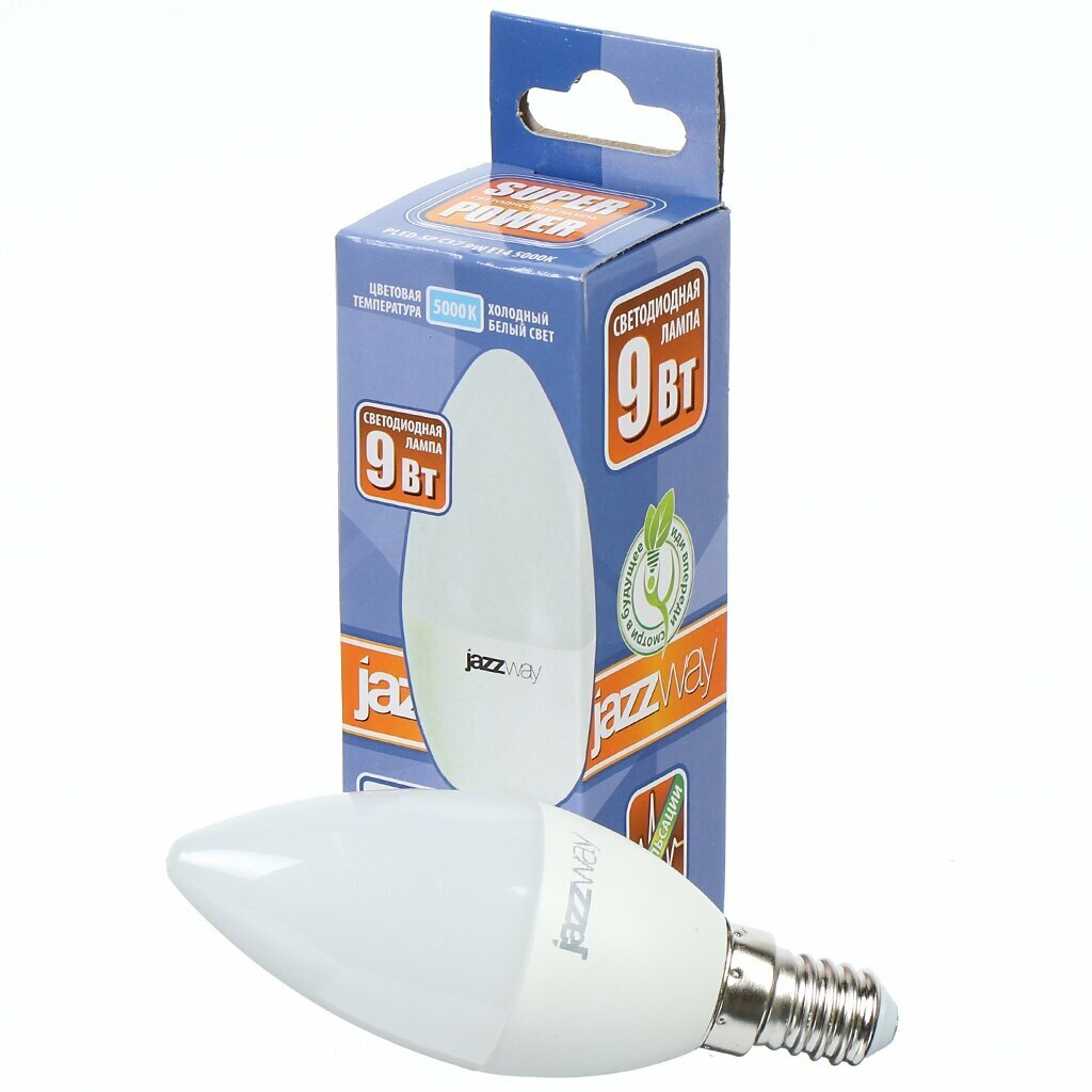 Лампа светодиодная E14, 9 Вт, 75 Вт, свеча, 5000 К, свет холодный белый, JazzWay, PLED- SP C37