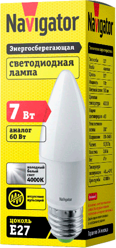Лампа светодиодная E27 Navigator Свеча, 7Вт, 4000К, лампочка 1 шт. 94494