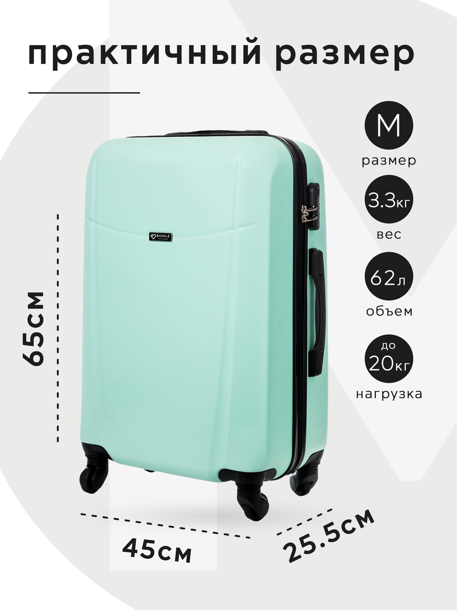 Купить Чемодан Bonle, премиум ABS-пластик, Мятный, размер M, 65 см, 62 л