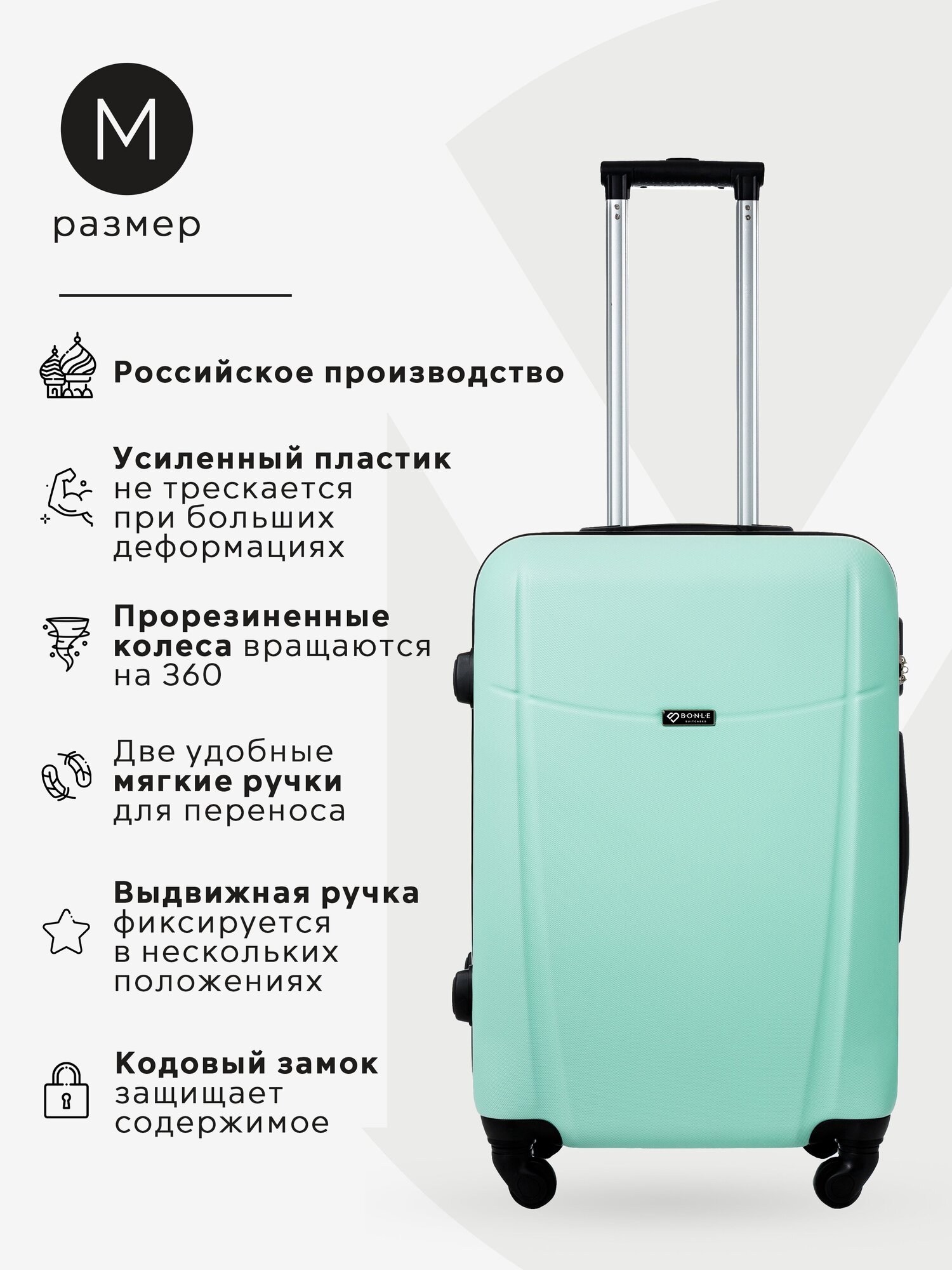 Ниже Вы можете прочитать отзывы на Чемодан Bonle, премиум ABS-пластик, Мятный, размер M, 65 см, 62 л, ознакомится с подробными характеристиками, посмотреть интересные обзоры и фотографии на Чемодан Bonle, премиум ABS-пластик, Мятный, размер M, 65 см, 62 л.