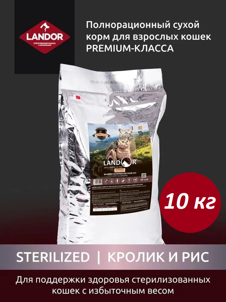 Купить LANDOR CAT ADULT STERILIZED RABBIT & RICE для взрослых кастрированных котов и стерилизованных кошек с кроликом и рисом (10 кг)