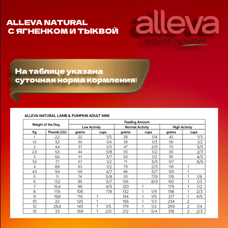ALLEVA NATURAL ADULT DOG MINI LAMB & PUMPKIN низкозерновой для взрослых собак маленьких пород с ягненком и тыквой (2 + 2 кг)