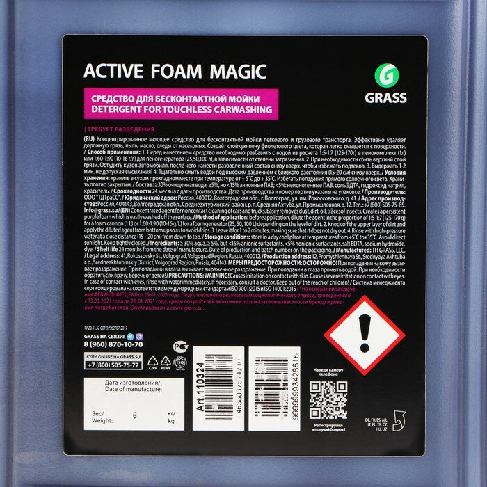 GRASS 110324 Активная пена 6кг - Active Foam Magic для бесконтактной мойки авто, меняет цвет после нанесения на кузов, 10-20 г/л в пеногенератор, 150-200 г в пенокомпле 1шт