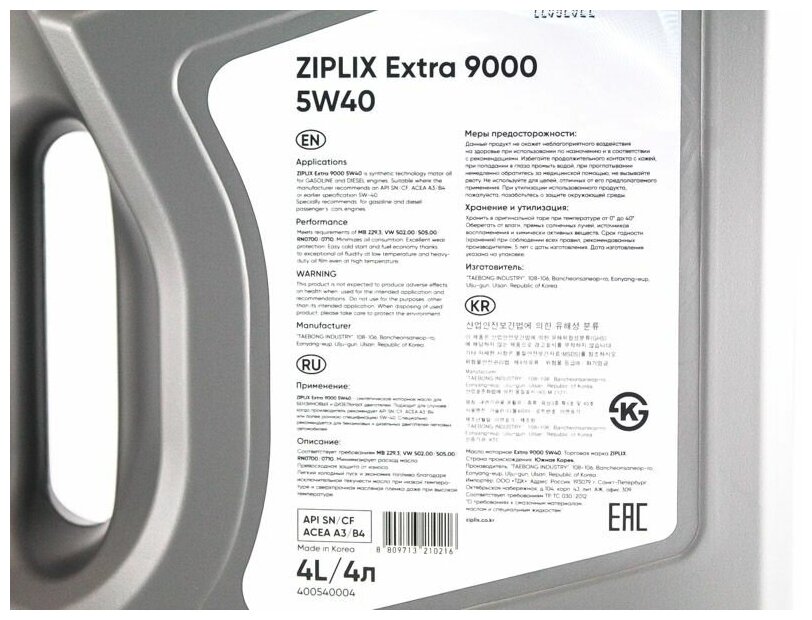 Масло моторное ZIPLIX EXTRA 9000 5W40 (4л.) синтетика Корея ACEA A3/B3, A3/B4, API SN/CF; MB 229.3; VW 502.00/505.00/ RN0700/RN0710 / 400540004 интересное: