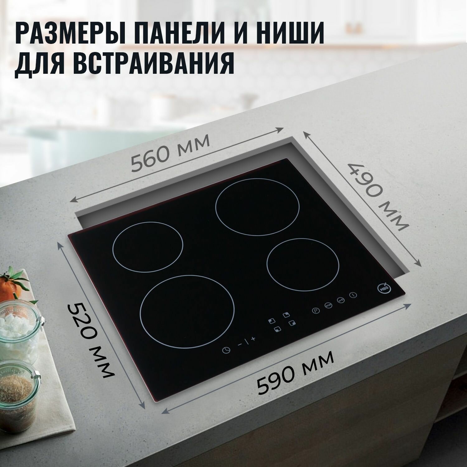 | Безопасность | защитное отключение конфорок / кнопка блокировки панели / индикатор остаточного тепла |