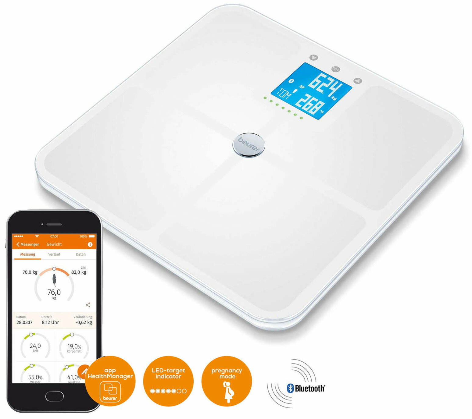 | Дополнительная информация | бесплатное приложение Beurer HealthManager; индикация калорий, скорости активного/основного обмена веществ и ИМТ; режим беременность; индикация заряда батареи; дисплей со светящимися символами |