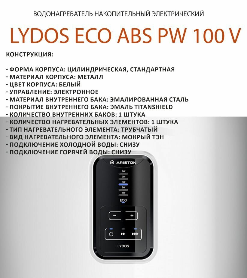 Водонагреватель электрический накопительный ARISTON LYDOS ECO ABS PW 100V, сталь TitanShield, 100л, 2,5кВт