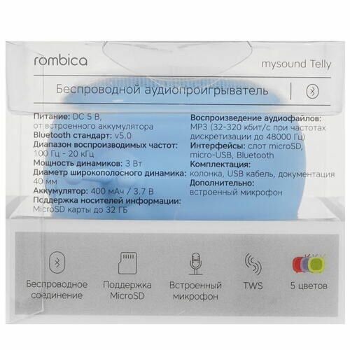 Портативная колонка Rombica Mysound Telly, голубой, 3 Вт, Bluetooth, 400 мА*ч