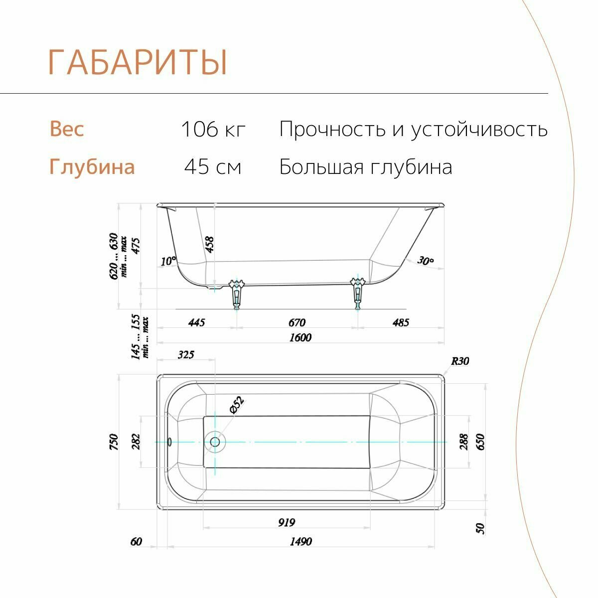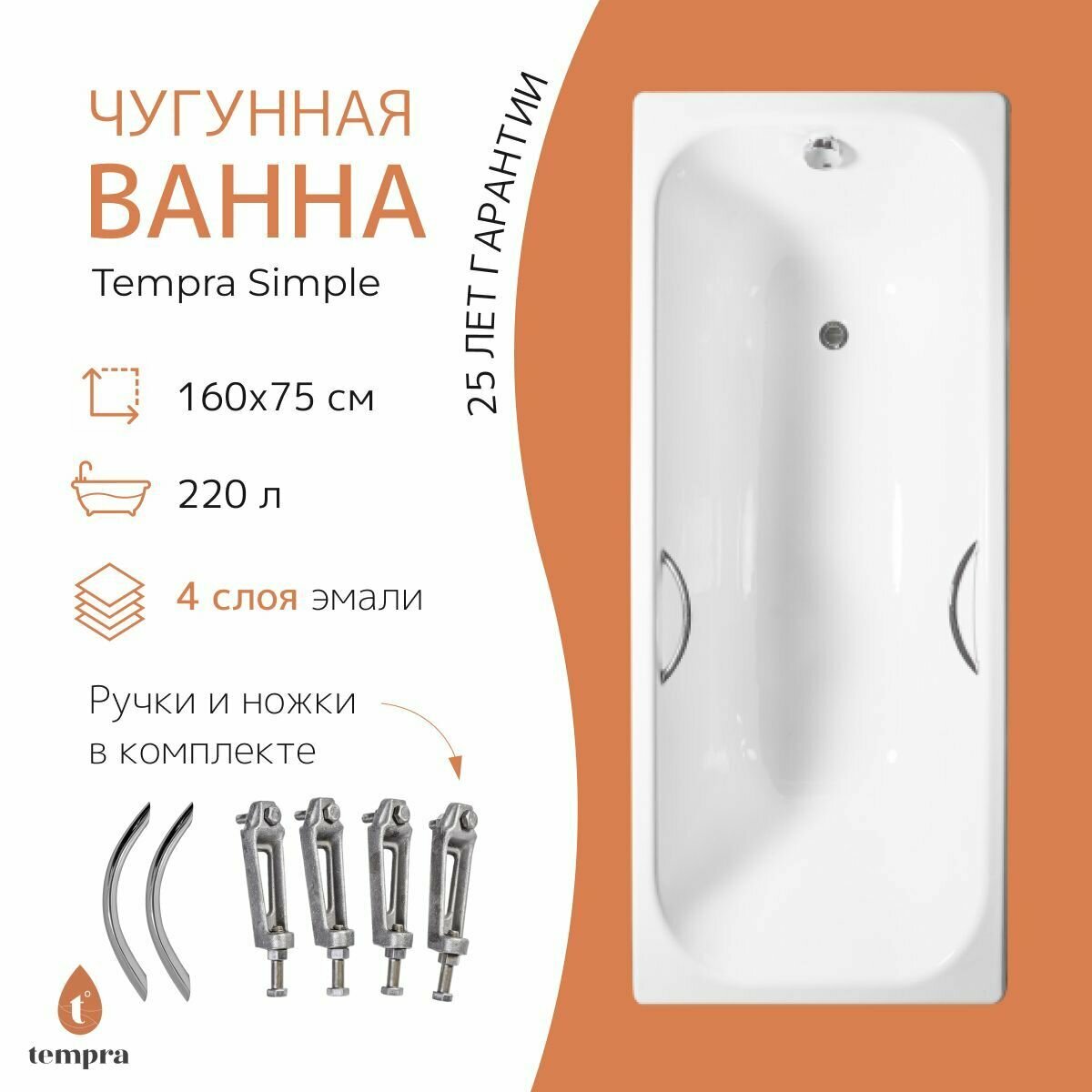 Ванна чугунная tempra Simple 160x75 круглые ручки интересное: