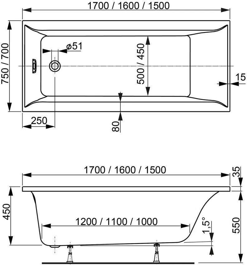 Ванна акриловая VAGNERPLAST VERONELA прямоугольная, 170х75 см, белая (VPBA170VEA2X-04)