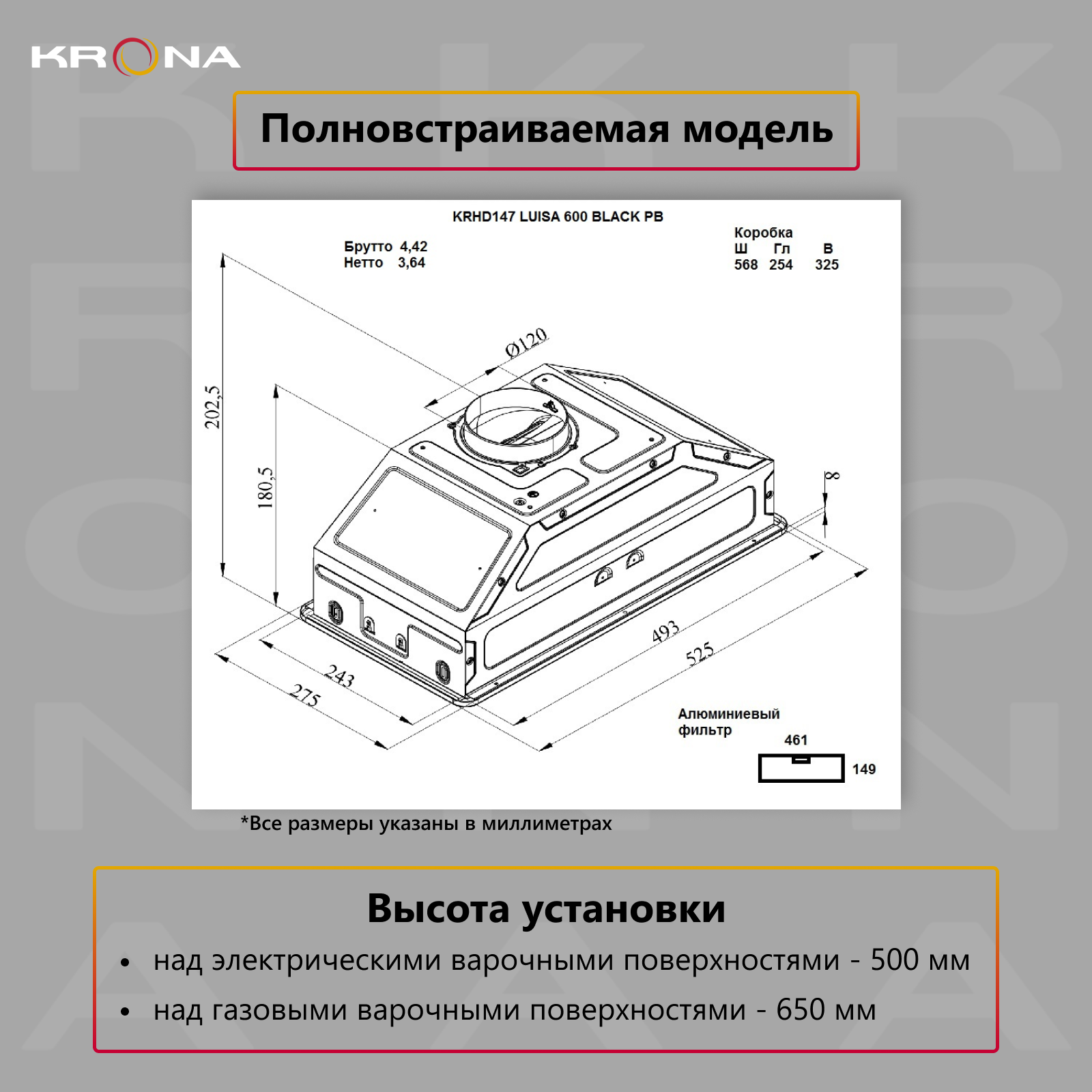 Встраиваемая вытяжка Krona Kamilla 500 BLACK .