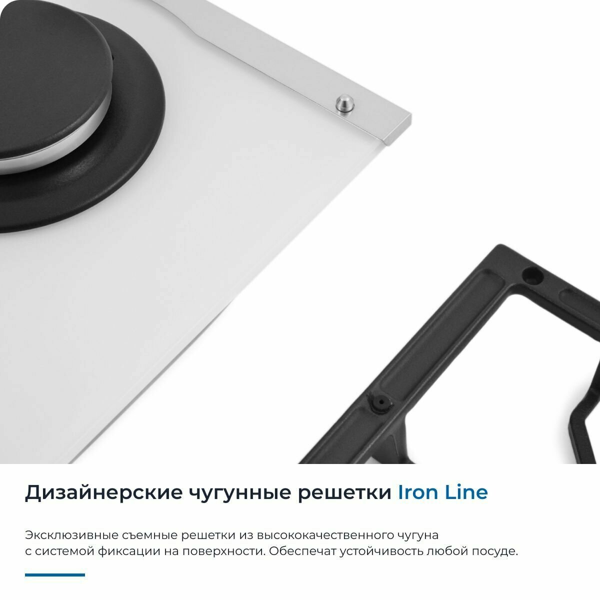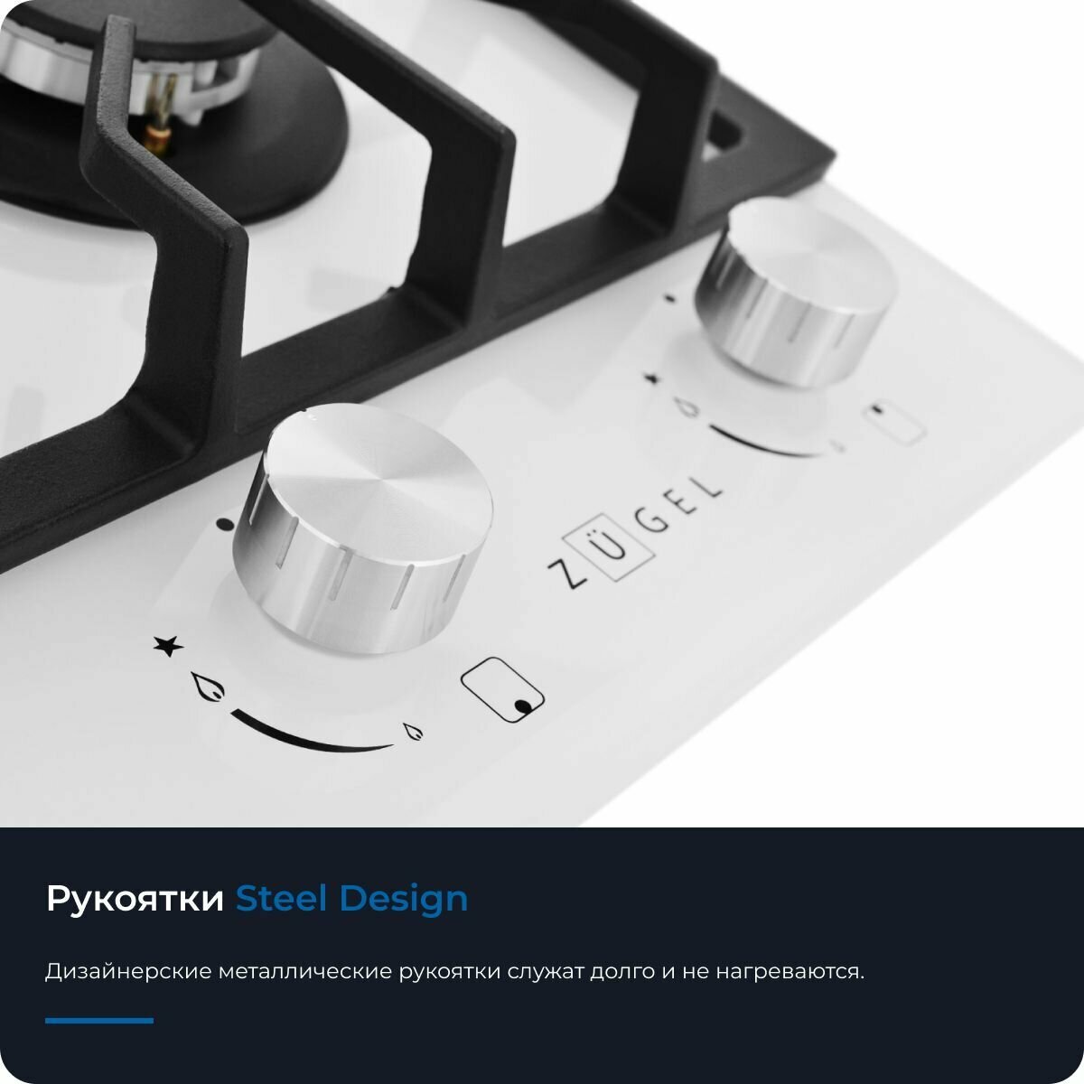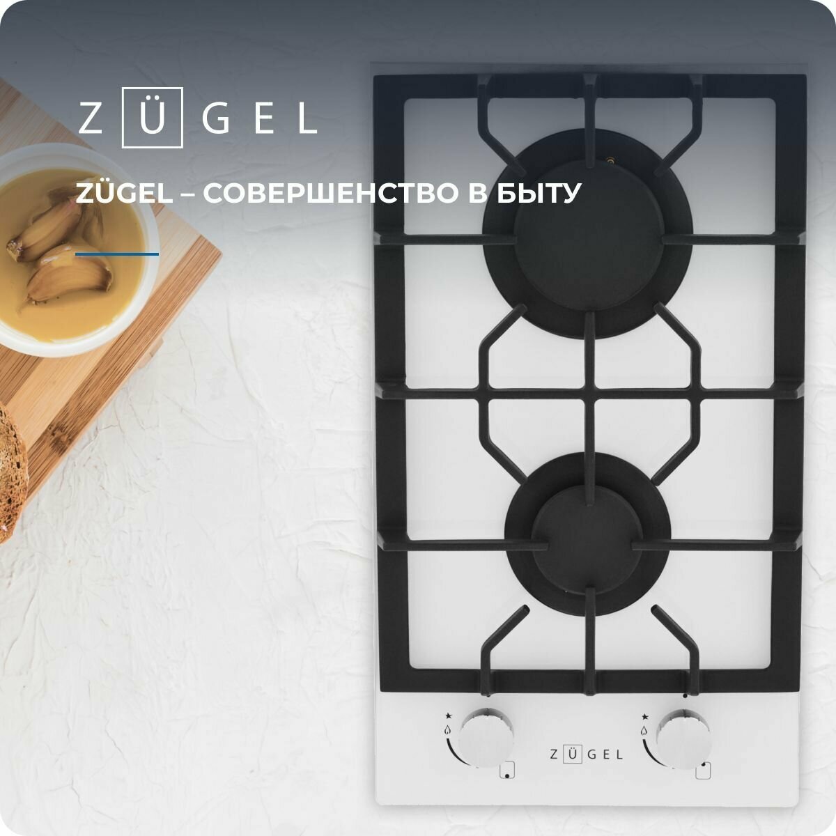 Газовая варочная панель ZUGEL ZGH291W, газ-контроль, автоматический электроподжиг, решетки чугун, закаленное стекло, 2 конфорки, белый