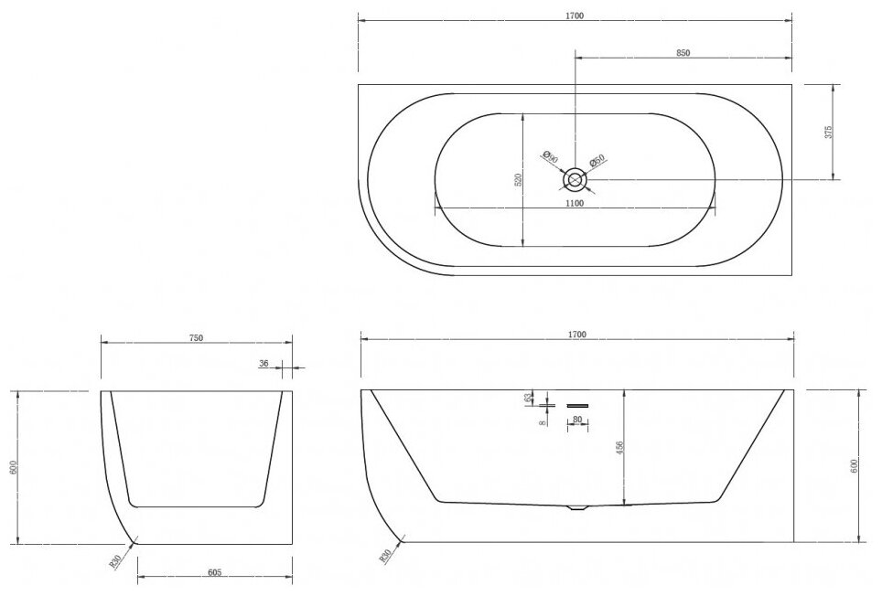 Акриловая ванна 170х75 см R Abber AB9315 R