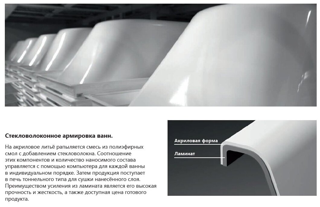 | Дополнительная информация | литьевой акрил Lucite вертикального выдува; равномерная толщина материала по всей площади ванны; армирование стекловолокном |