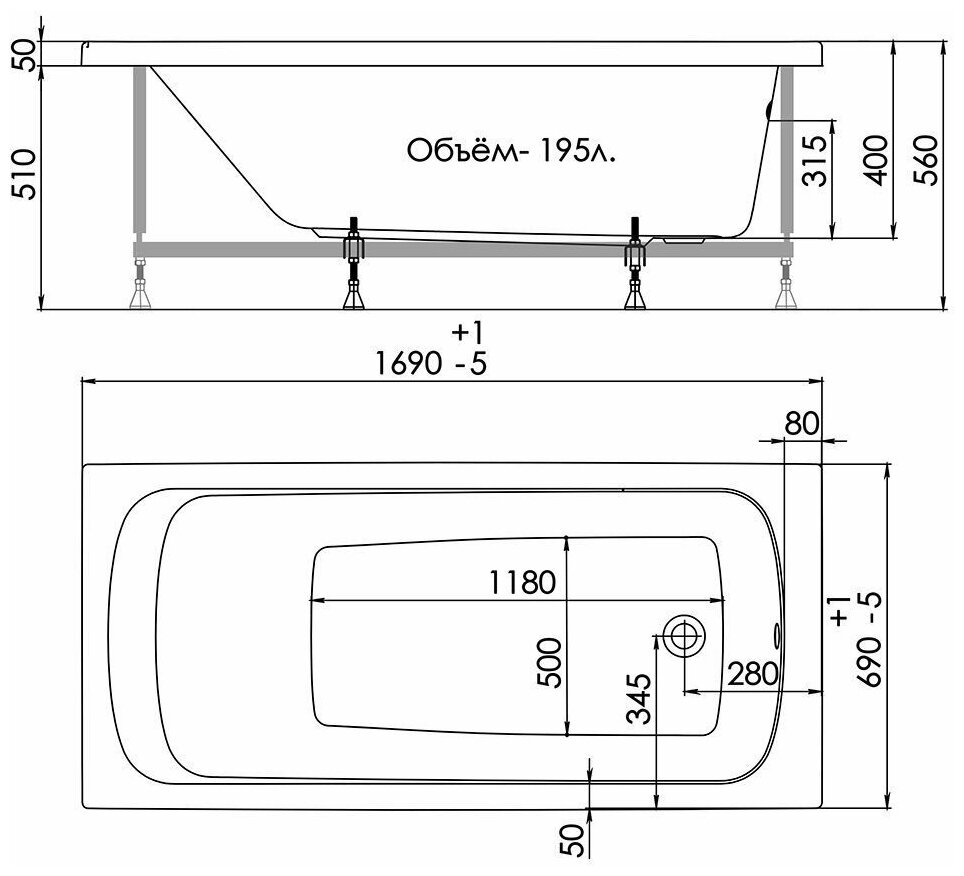 Акриловая ванна 1ACReal Gamma 120х70 см, в комплекте с ножками для ванны