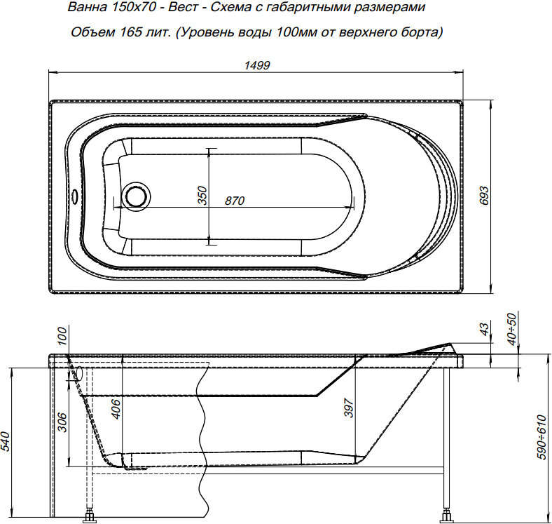Ванна акриловая Aquanet WEST 150*70 (NEW) к/с71 (240462)