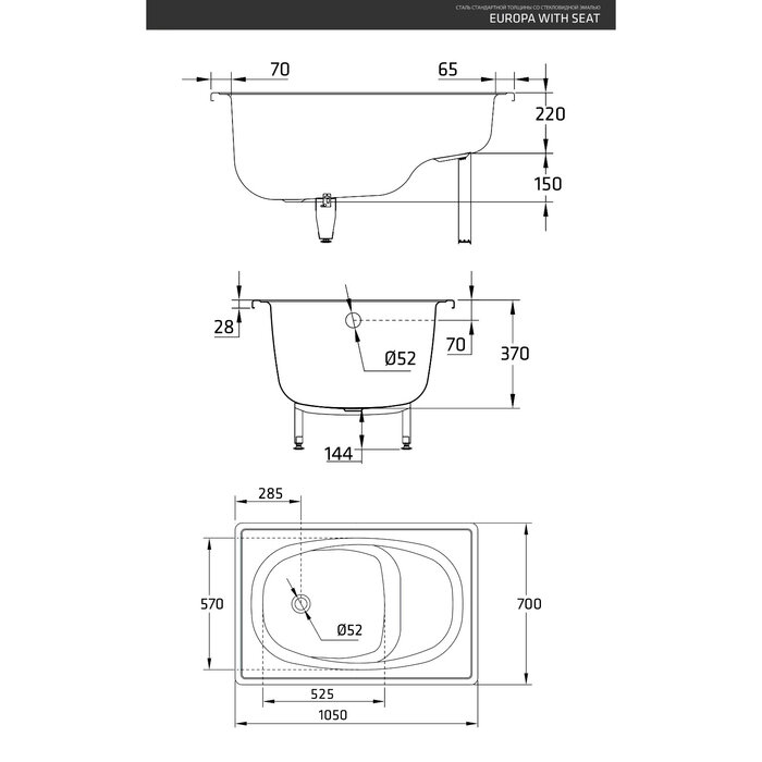 Ванна стал. EUROPA 105 х 70 с сиденьем