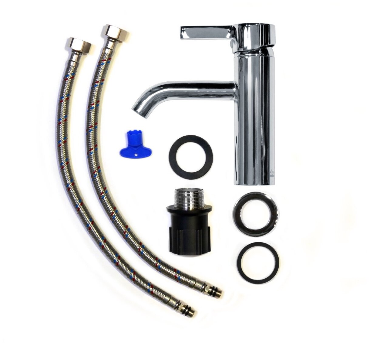 | Комплектация | Смеситель, набор крепежа для установки смесителя, 2 гибких шланга 35 см для подвода воды |