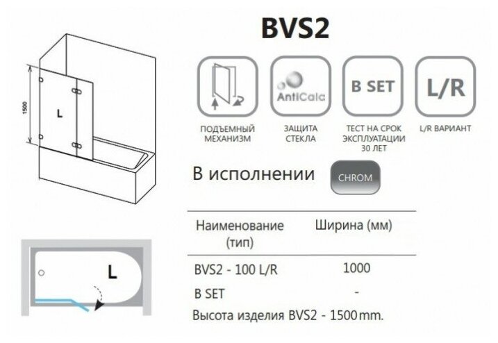 Шторка для ванны Ravak BVS2 100 L 7ULA0A00Z1 (хром + транспарент)