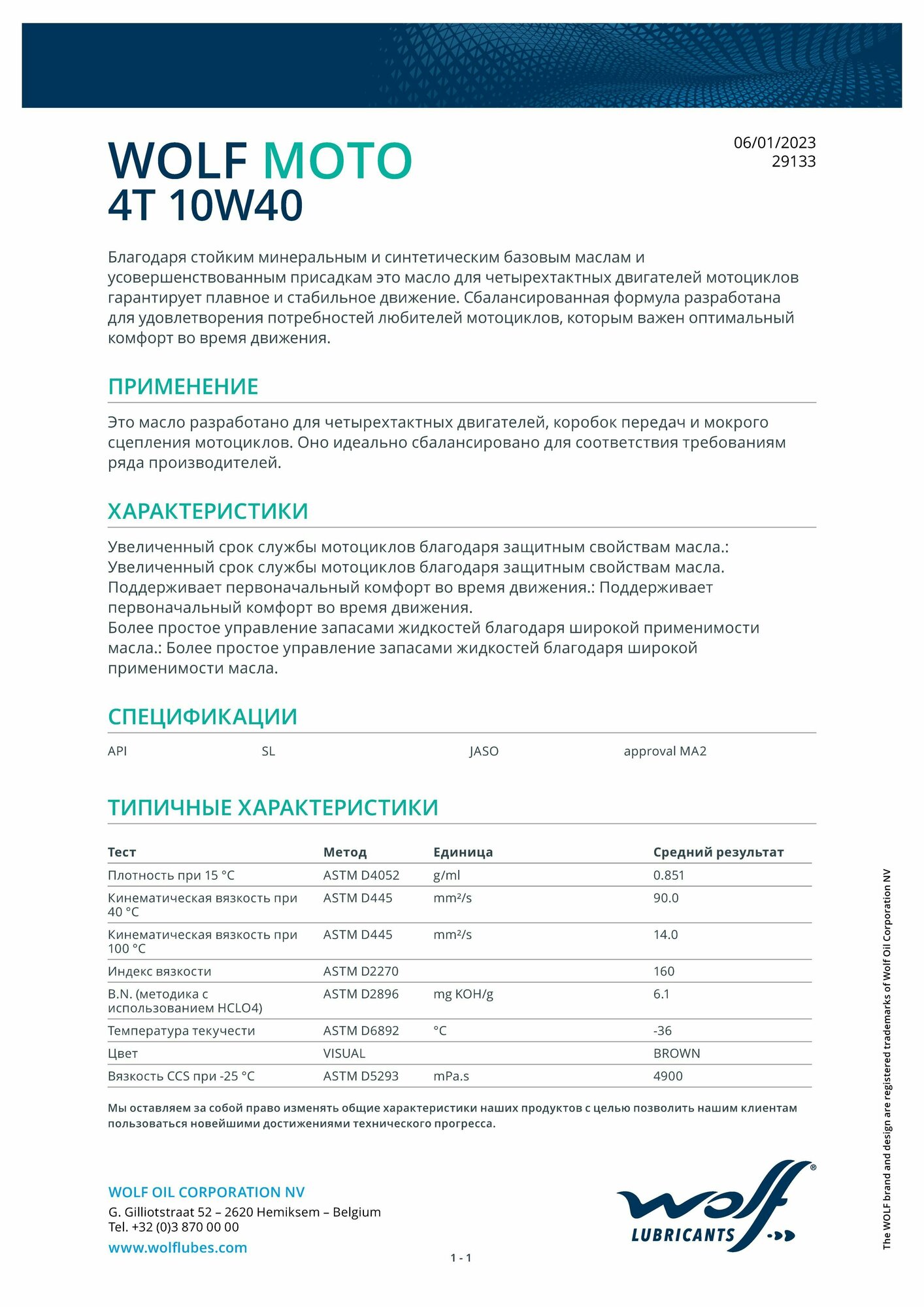 WOLF OIL 291334 MOTO 4T 10W-40 4 масо моторное (PN 1043813)