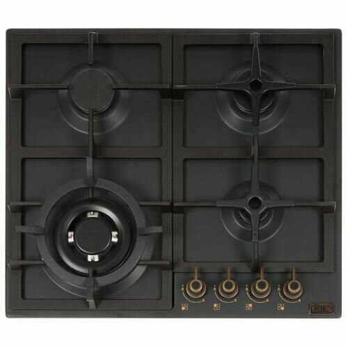 Встраиваемые газовые панели Korting/ Газ, Calabria, 60x51 см, газовая, независимая, электроподжиг, газ-контроль, чугунные решетки, чугунный адаптер для WOK-конфорки и адаптер для кофейника, черная, цвет ручек-бронза