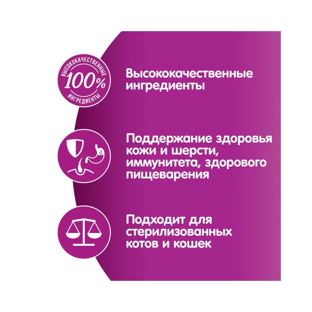 | Особые потребности | для стерилизованных/кастрированных / для здоровья кожи и блеска шерсти |