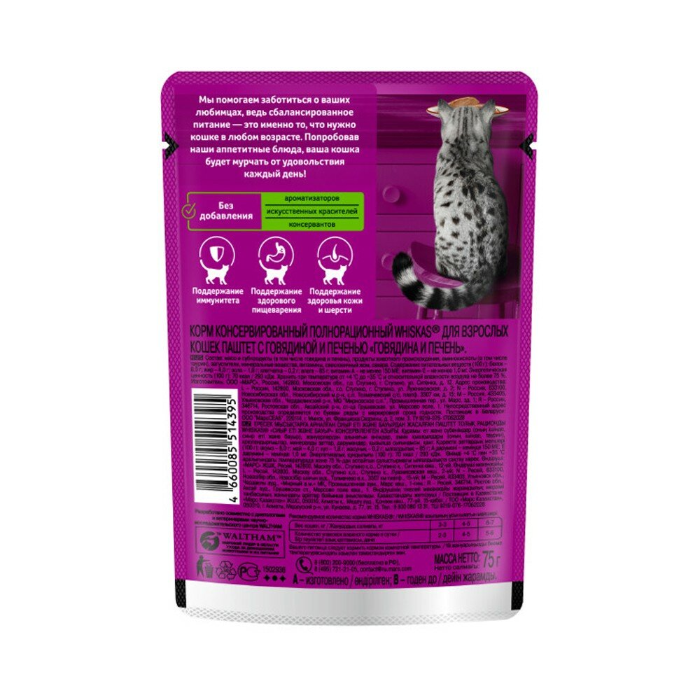 Корм для кошек WHISKAS говядина, печень паштет пауч 75г (упаковка - 24 шт) интересное: