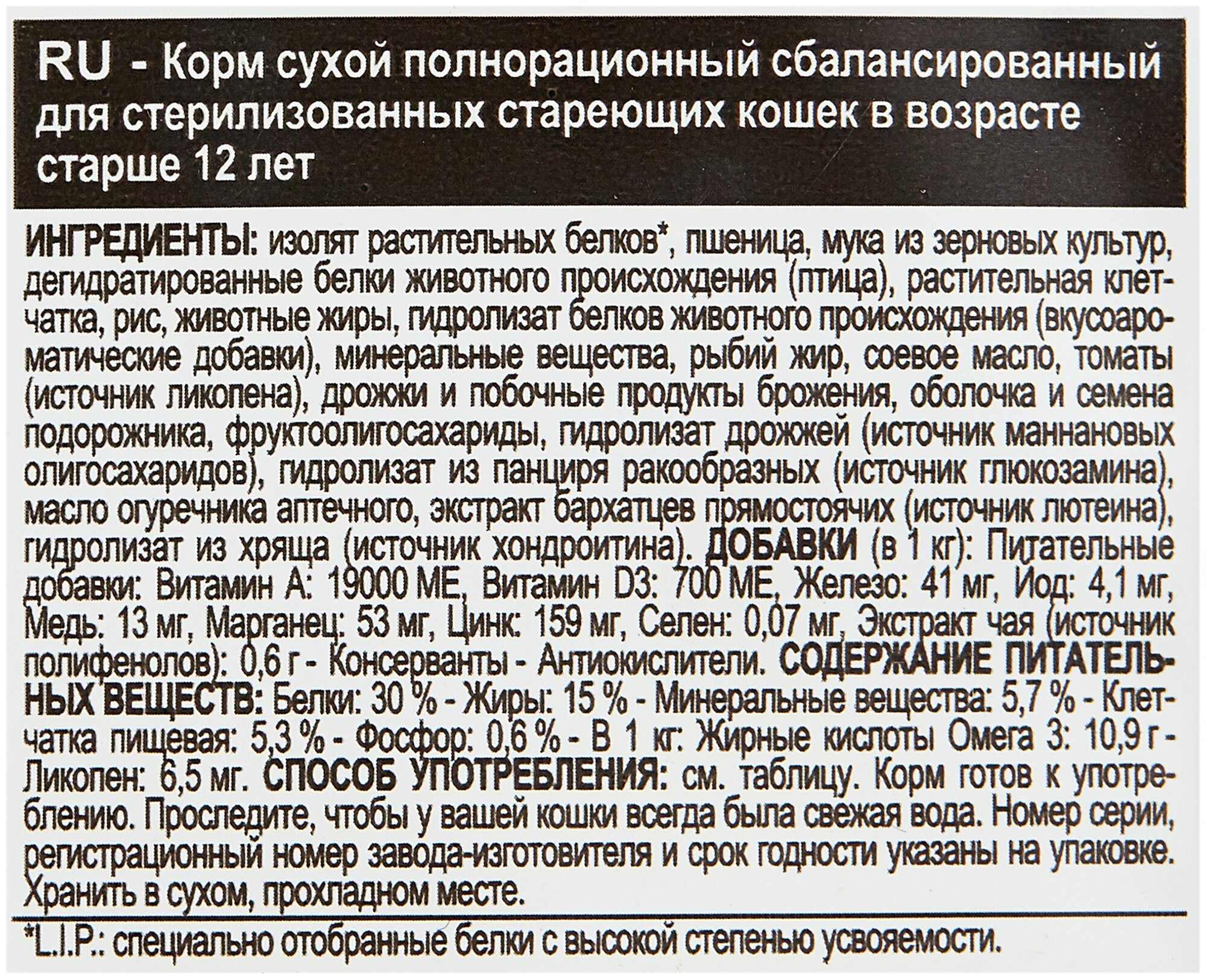 | Состав | изолят растительных белков, пшеница, мука из зерновых культур, дегидратированные белки животного происхождения (птица), растительная клетчатка, рис, животные жиры, гидролизат белков животного происхождения (вкусоароматические добавки), минеральные вещества, рыбий жир, соевое масло, томаты (источник ликопина), дрожжи и побочные продукты брожения, оболочка и семена подорожника, фруктоолигосахариды, гидролизат дрожжей (источник мaннановых олигосахаридов), гидролизат из панциря ракообразных (источник глюкозамина), масло огуречника аптечного, экстракт бархатцев прямостоячих (источник лютеина), гидролизат из хряща |