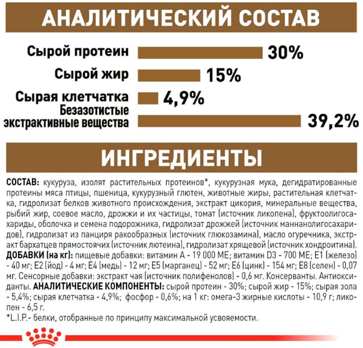 | Состав | изолят растительных белков, предварительно обработанная пшеничная мука, животные жиры, дегидратированные белки животного происхождения (птица), рис, кукуруза, растительная клетчатка, гидролизат белков животного происхождения (вкусоароматические добавки), экстракт цикория, минеральные вещества, рыбий жир, соевое масло, дрожжи и побочные продукты брожения, томаты (источник ликопена), фруктоолигосахариды, оболочка и семена подорожника, гидролизат дрожжей (источник мaннановых олигосахаридов), гидролизат из панциря ракообразных (источник глюкозамина), масло огуречника аптечного, экстракт бархатцев прямостоячих (источник лютеина), гидролизат из хряща (источник хондроитина) |