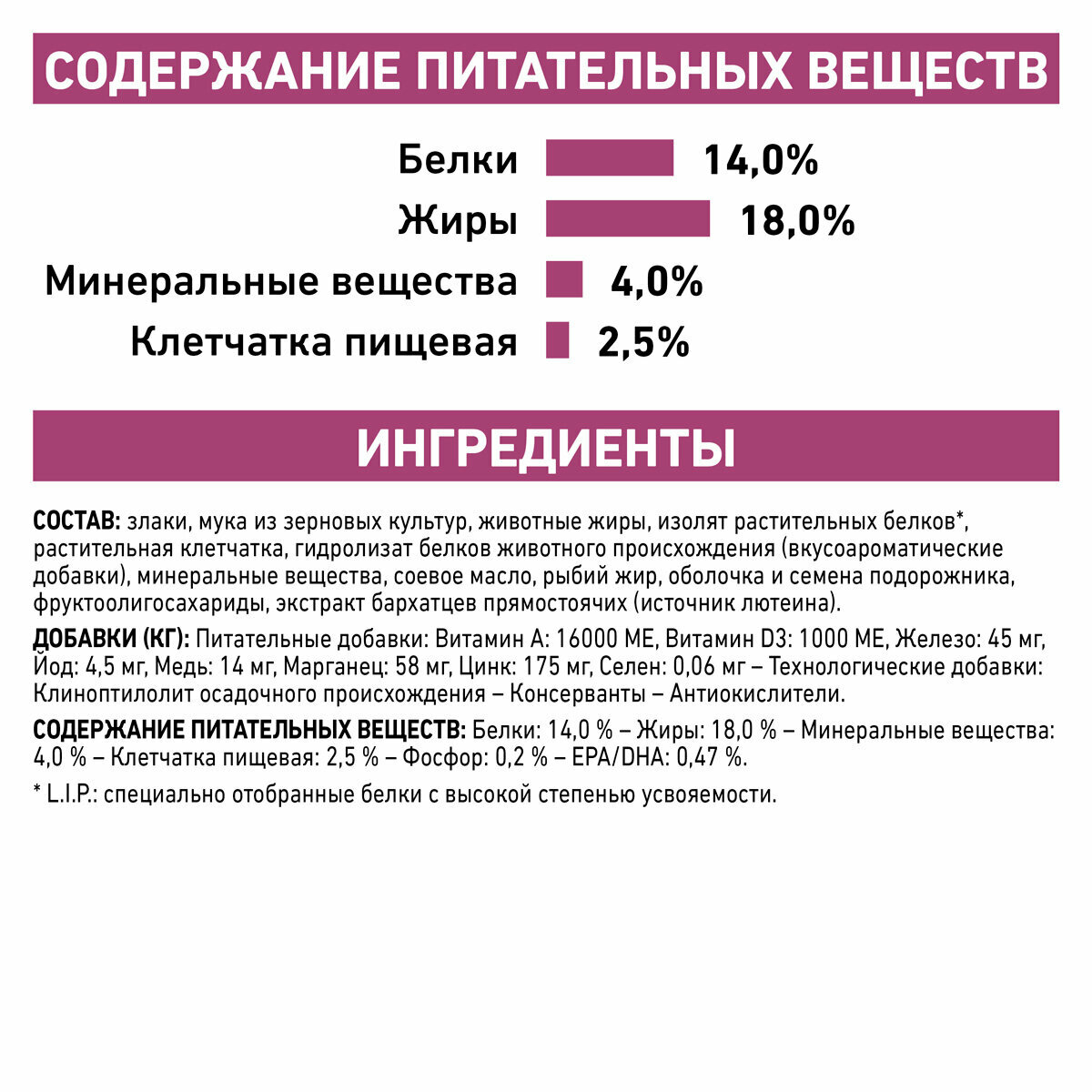 | Состав | злаки, мука из зерновых культур, животные жиры, изолят растительных белков, растительная клетчатка, гидролизат белков животного происхождения (вкусоароматические добавки), минеральные вещества, соевое масло, рыбий жир, оболочка и семена подорожника, фруктоолигосахариды, экстракт бархатцев прямостоячих (источник лютеина) |