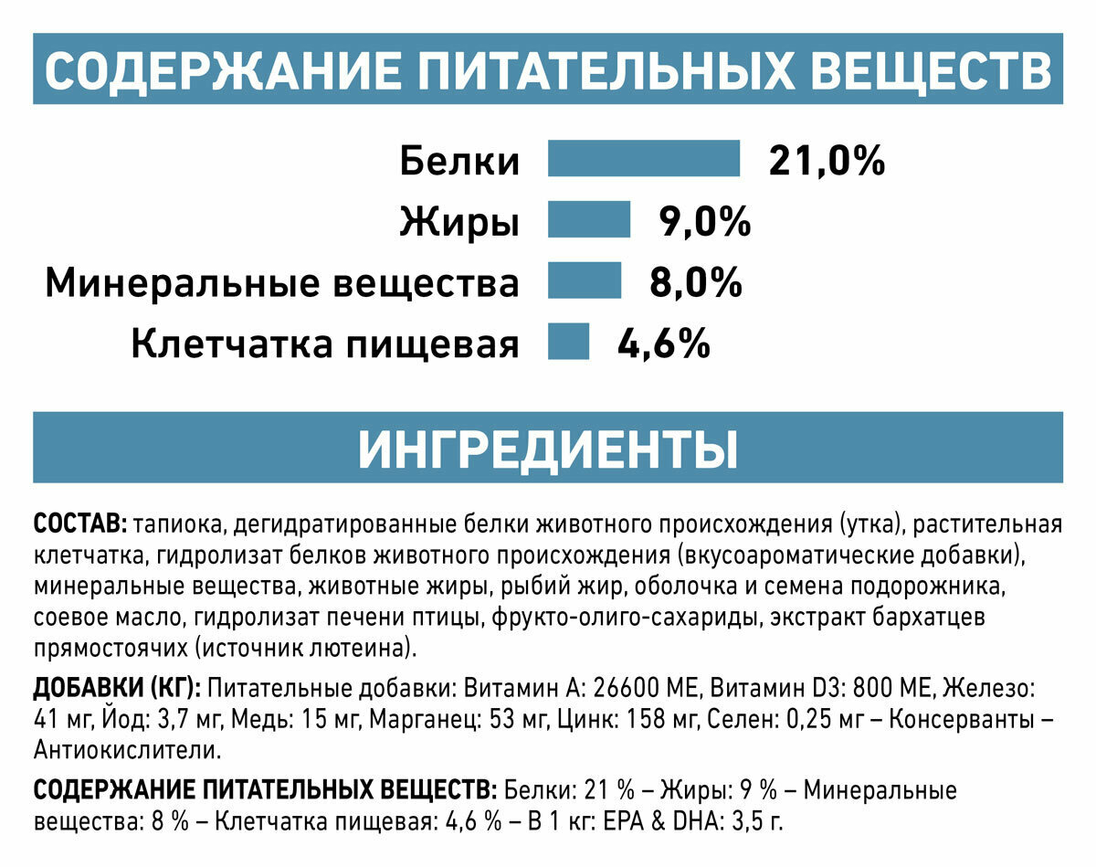| Состав | Тапиока, дегидратированное мясо утки, растительная клетчатка, гидролизованные куриные белки, животные жиры, свекольный жом, рыбий жир, минеральные вещества, соевое масло, оболочки и семена подорожника, фруктоолигосахариды, экстракт бархатцев прямостоячих (источник лютеина). |