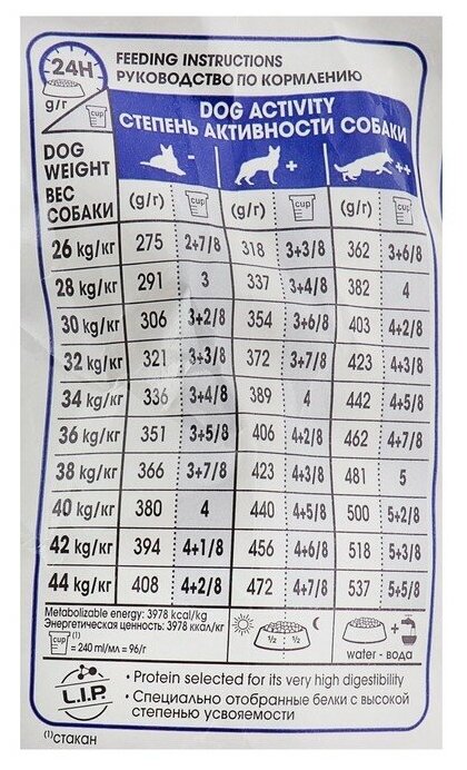 | Дополнительная информация | эксклюзивный комплекс питательных веществ, включающий высококачественные белки и сбалансированное количество клетчатки, способствует лучшей усвояемости; формула обогащена жирными кислотами Омега 3 (EPA-DHA), способствующими поддержанию здоровья кожи; способствует поддержанию здоровья костей и суставов, подверженных значительным нагрузкам из-за большого веса у собак крупных размеров |