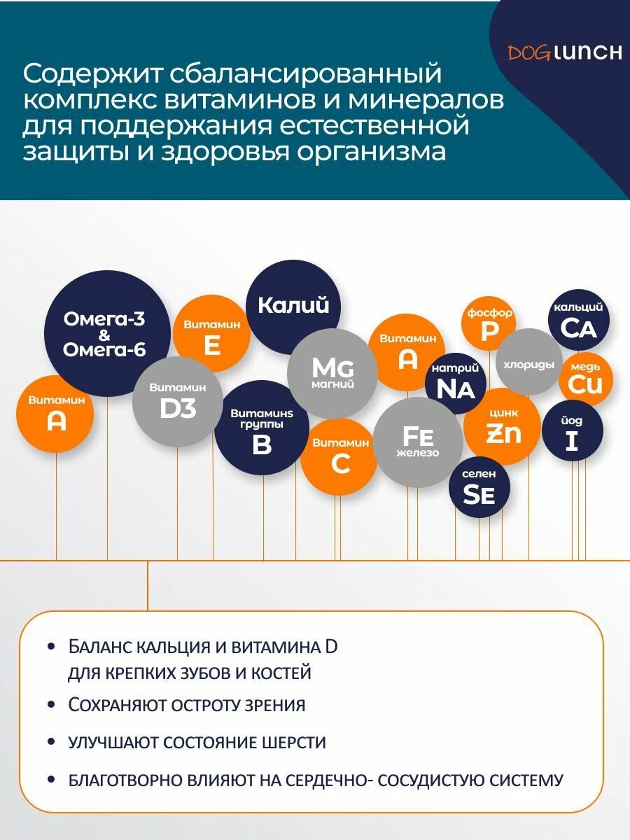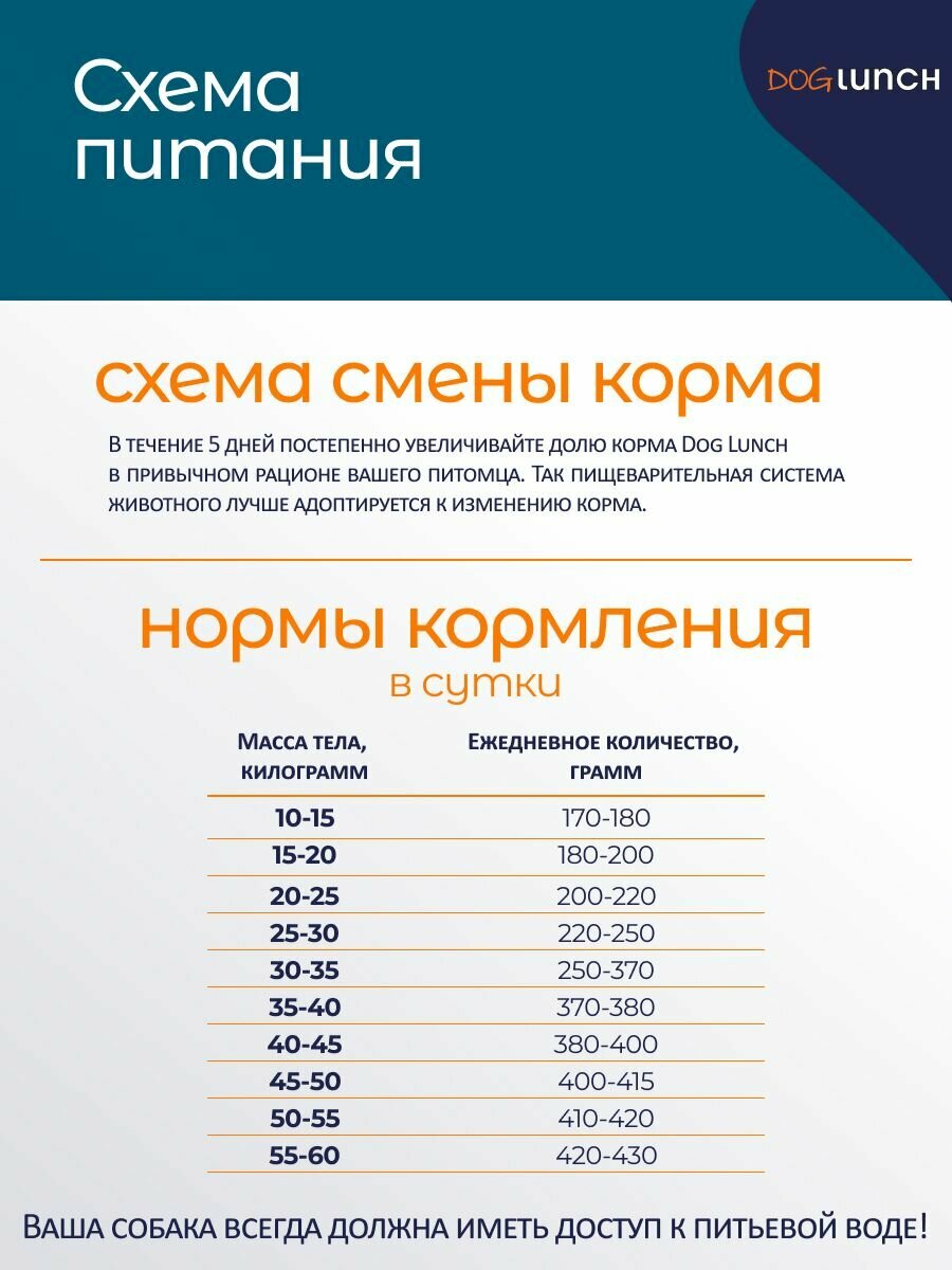 | Дополнительная информация | Органолептические свойства: Светло-коричневая гранулы диаметром 12 мм. Переход с предыдущего рациона следует осуществлять постепенно, небольшими порциями в течение 5-7 дней. Если вы уже используете любой из сухих кормов Dog Lunch, то можно безопасно чередовать вкусы в рамках возрастной линейки без переходного периода. При кормлении необходимо учитывать активность, возраст размер и индивидуальные особенности Вашего питомца. У питомца всегда должен быть доступ к свежей питьевой воде. |