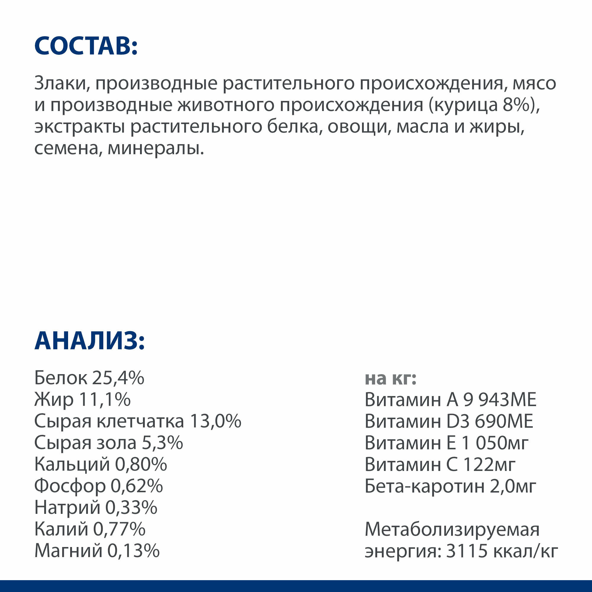 | Состав | Злаки, производные растительного происхождения, мясо и производные животного происхождения, экстракты растительного белка, овощи, масла и жиры, семена, минералы |